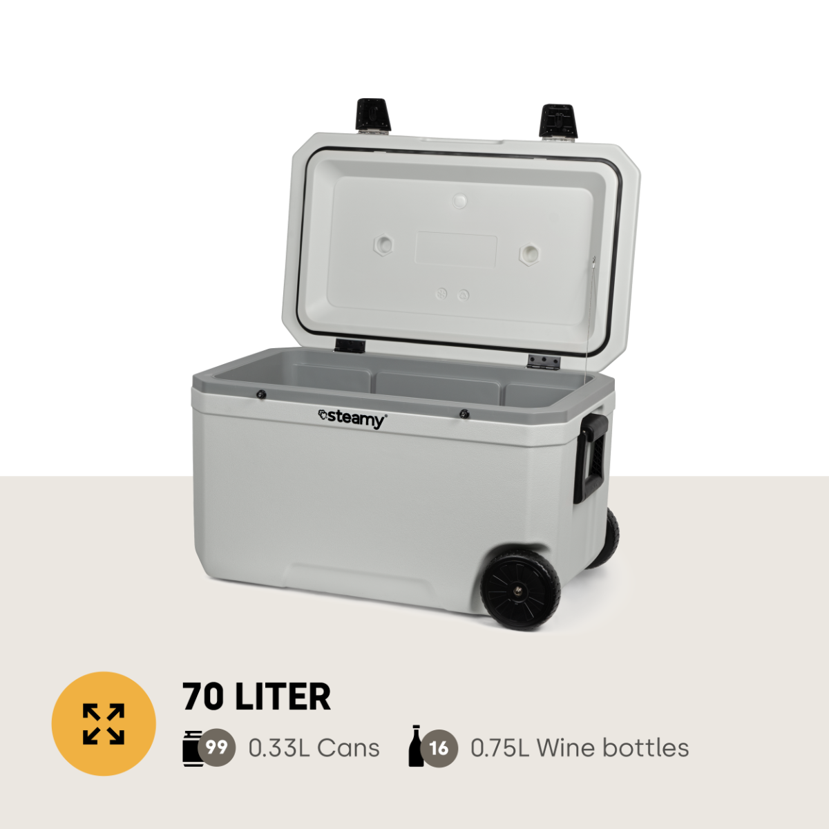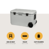 Cutia frigorifica are o capacitate de 70 de litri, ceea ce este suficient pentru a păstra cantități mari de băuturi și alimente reci și proaspete, în timpul tuturor aventurilor tale. Roțile și mânerul rabatabil fac ca deplasarea cutiei frigorifice sa se faca fără prea mult efort, chiar și atunci când este complet umplută.